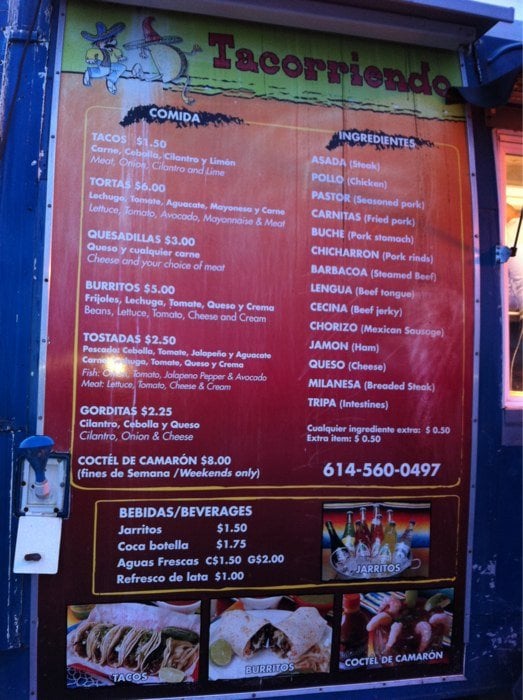 Introducing Tacoriendo Movil, a Mexican food truck located at 3344 Allegheny Ave in Columbus, OH. Their menu features customizable options like Build Your Own Burrito, Gordita, and Taco Supreme, as well as traditional dishes like Chilaquiles with your choice of meat. The Bebidas section offers Mexican soft drinks and Aguas Frescas to complement your meal. Customers rave about the authentic flavors and great service, with favorites including the Cubana torta and tacos al pastor. The friendly staff and reasonable prices make this spot a must-visit for Mexican food lovers. Don't forget to try the Al Pastor burrito with their special green sauces for an extra kick of flavor. Make sure to call ahead to avoid the long lines and ensure a delicious meal at Tacoriendo Movil.